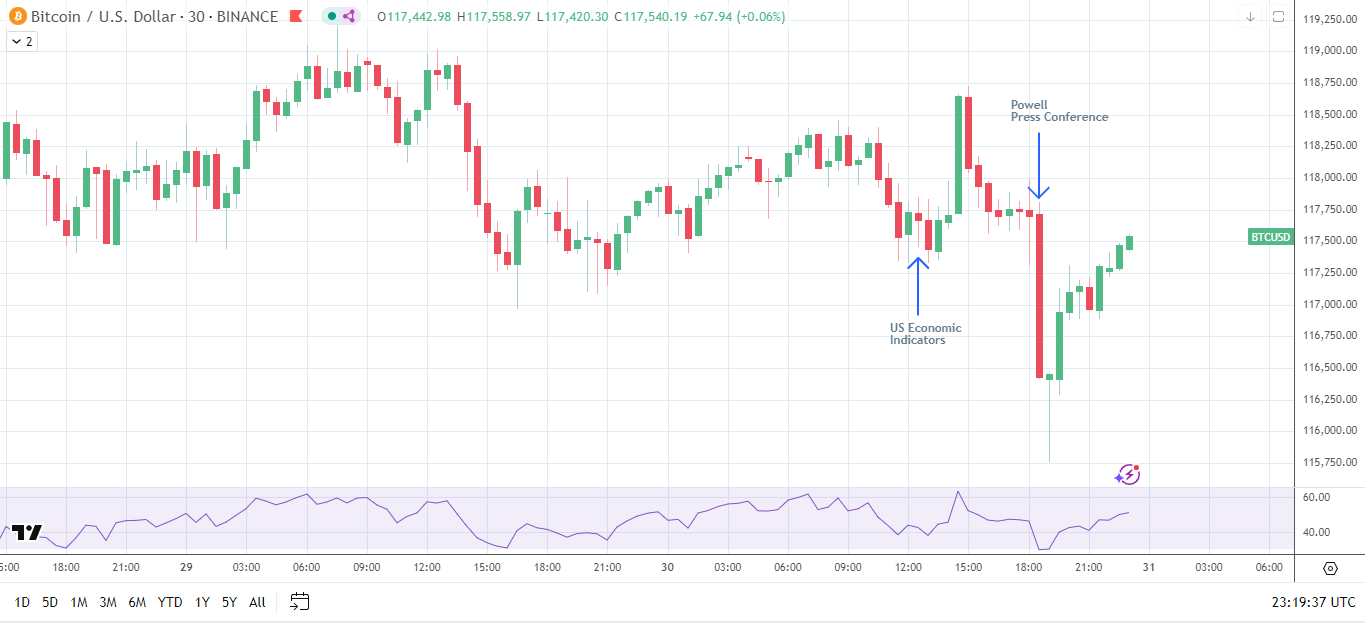 Ahead of the interest rate decision and press conference, US economic data pointed to strong momentum in the second quarter. The economy expanded by 3% after contracting 0.5% in the first quarter. Labor market data suggested resilience, with the ADP reporting a 104k rise in private sector jobs in July, reversing a 23k drop in June. BTC climbed to a post-data high of $118,729 before the Powell-triggered sell-off.
